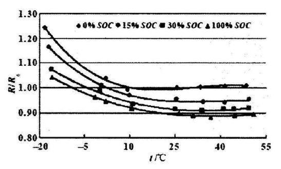 锂电池温度与电阻的关系,如下图所示。不同的曲线代表电池自身不同的荷电量。任何一个荷电量下,电池内阻都随着温度的降低而明显升高,荷电量越低的电芯,内阻越大,并且这个趋势也随着温度的变化而保持不变。