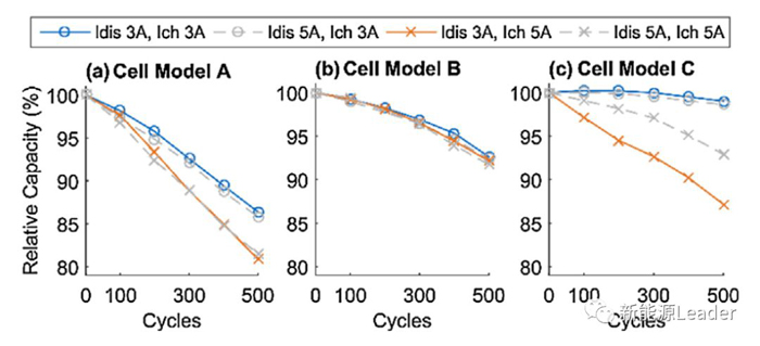 Peter Keil的工作表明,对于电池循环寿命影响最大的为充电电流,对于电池A和C在5A大电流下进行充电时会导致锂电池的循环寿命严重缩短,但是电池B的循环寿命似乎受充电电流的影响不大。其次是电池的充电截止电压,高的充电截止会严重的缩短锂电池的使用寿命,特别是对于电池B和C将充电截止电压提高50mV就会严重的影响电池的循环寿命。