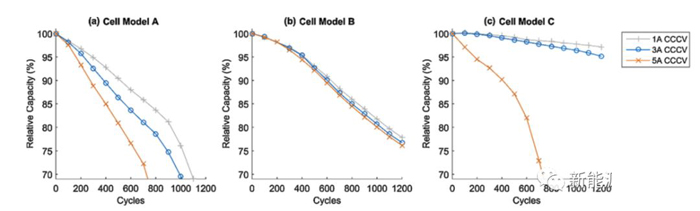 下图为采用CCPC和PC充电策略的三种电池的循环数据,可以看到对于三种电池采用CCPC充电策略时,电池的循环寿命实际上与采用相同充电电流的CCCV充电策略是相同的。